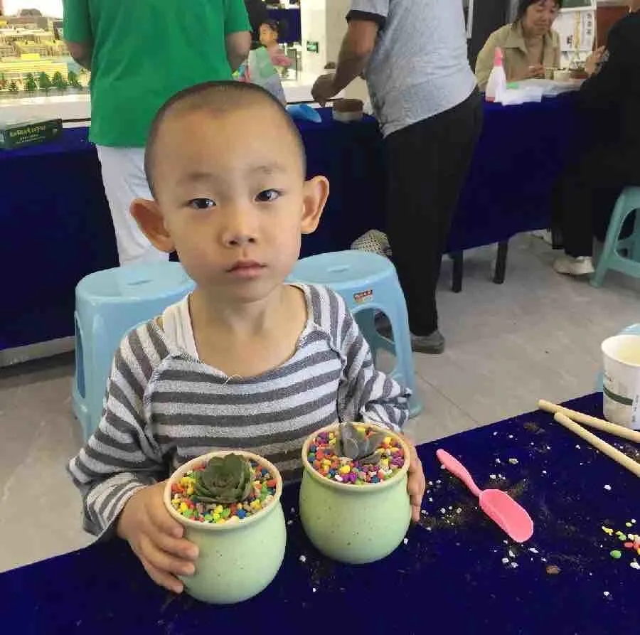 形態(tài)各異的多肉盆栽,呈現(xiàn)了一場繽紛的植物盛宴,家長和小朋友們熱情滿滿。