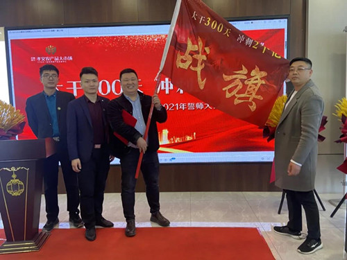 最后, 胡總授予魏總“目標責任書”,孫總授予“戰(zhàn)旗”,在全體員工激情迸發(fā)之下,迎來了誓師環(huán)節(jié)。手持戰(zhàn)旗,鏗鏘誓言,敲響了出征的戰(zhàn)鼓。每個人都用斗志昂揚的士氣展示使命必達的決心。在同仁的見證下,營銷部案場精英、渠道精英,招商精英擔起了這份責任。