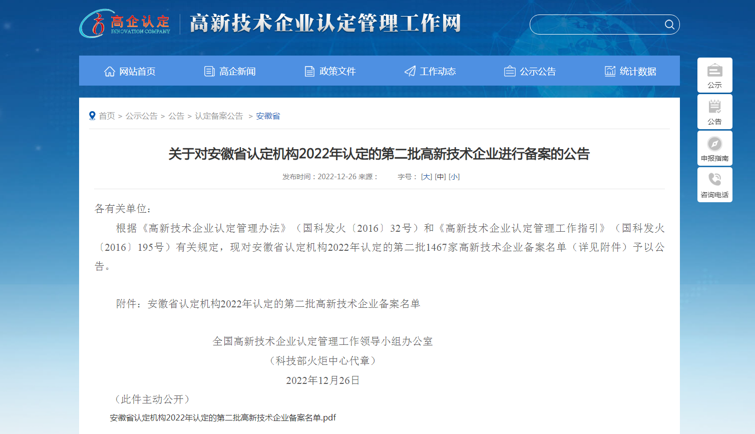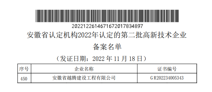 近日,高新技術企業(yè)認定管理工作網(wǎng)發(fā)布了《關于對安徽省認定機構2022年認定的第二批高新技術企業(yè)進行備案的公告》,鼎鑫集團下屬越騰建設工程有限公司榮獲國家高新技術企業(yè)資格。