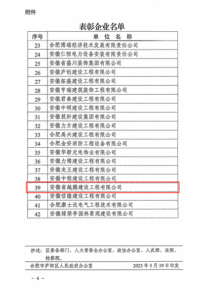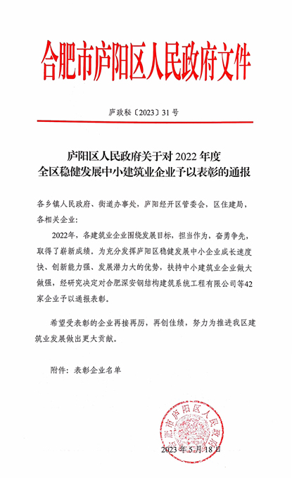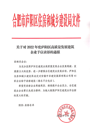 近日,合肥廬陽區(qū)發(fā)布了對2022年度全區(qū)穩(wěn)健發(fā)展中小建筑業(yè)企業(yè),高質(zhì)量發(fā)展建筑企業(yè)等予以表彰的通報,安徽省越騰建設(shè)工程有限公司位列其中。