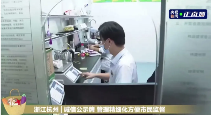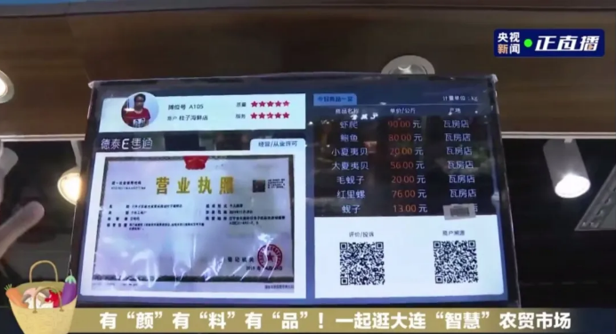 每個(gè)商戶的招牌下面都有一個(gè)屏幕,顯示著經(jīng)營(yíng)業(yè)戶的營(yíng)業(yè)執(zhí)照、食品類別、食品價(jià)格包括它的產(chǎn)地,一目了然,保證食品的品質(zhì)和安全。