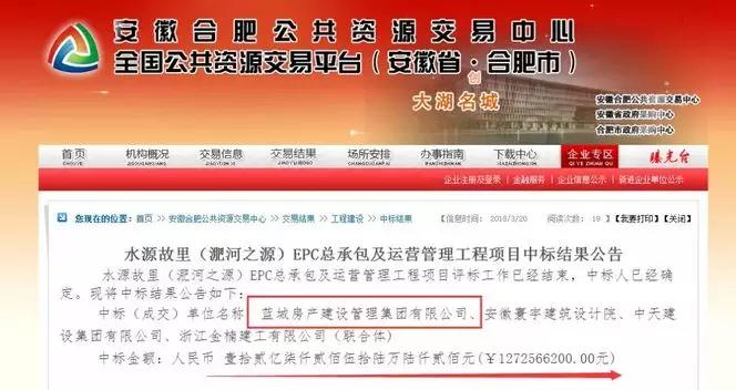3月20日,安徽合肥公共資源交易中心發(fā)布公告,水源故里(淝河之源)EPC總承包及運(yùn)營(yíng)管理工程項(xiàng)目成功中標(biāo),中標(biāo)金額12.725662億元。